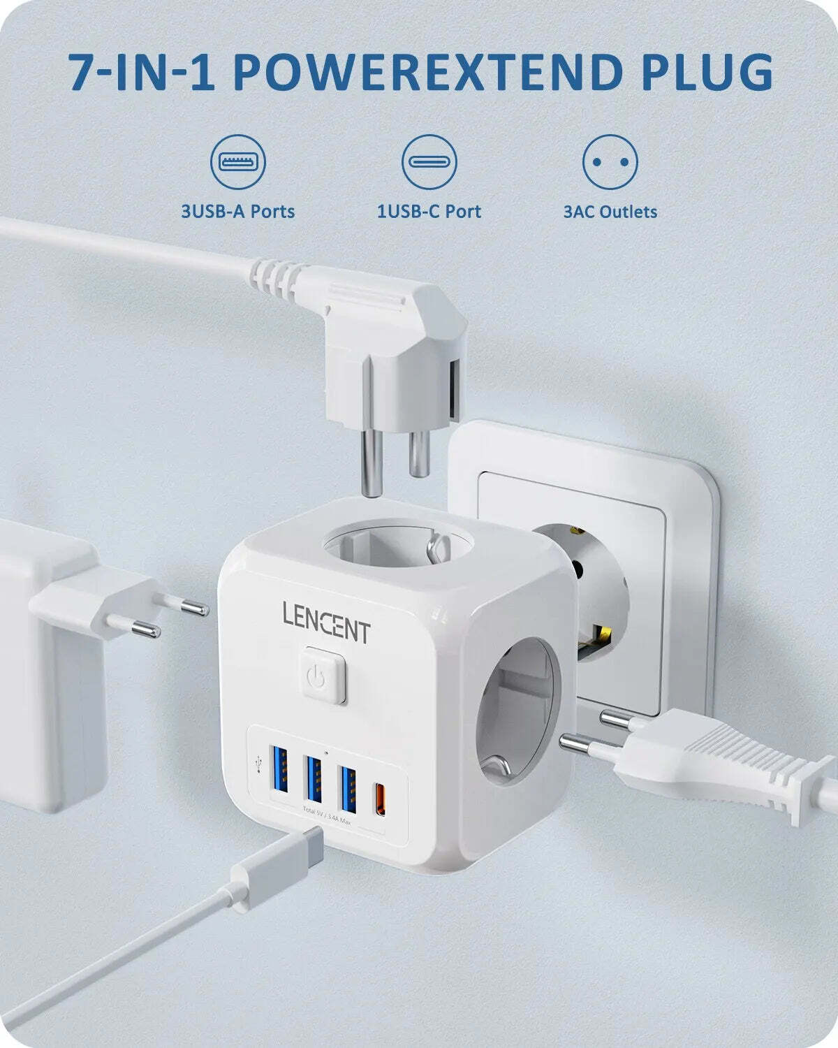 The unique power plug design allows you to use 3 large sockets, 3 USB ports, and 1 Type-C port at the same time without affecting the use of adjacent outlets.